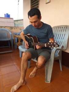 Le matin suivant, nous sommes attirés à l’étage par une douce mélodie de flûte. Nous tombons sur deux musiciens en train de jouer de la musique indienne. Thibaut saute sur l’ocassion d’étrenner sa toute nouvelle guitare et rejoint l’orchestre. Rencontre très sympathique et prémonitoire, qui nous laisse un délicieux avant-goût indien… Nous en profitons pour récolter de nombreux conseils pour notre séjour en Inde à venir.