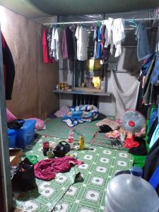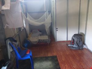 Nous logeons dans le bâtiment des garçons, un hangar-dortoir qui constitue également l’une des salles de classe. Autant dire que ça change du Lumpini, notre immeuble luxueux a Bangkok ! Douche au seau d’eau froide, moustiques par dizaines et matelas sale à même le sol. Mais nous ne nous plaignons pas, car nous avons hérité de la suite royale : nous avons la chance d’avoir notre espace privé et sommes les seuls à posséder un matelas. Les étudiants, ainsi que le volontaire arrivé juste après nous, se contentent d’une natte dans une chambre pour 4.