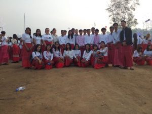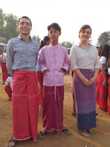 Nous arrivons un samedi après-midi, et les cours ne commencent que le lundi. Le dimanche, nous accompagnons toute la promotion pour la Fête Nationale Mon. Mais qu’est-ce donc qu’un Mon me direz-vous ? C’est une ethnie comptant un peu plus d’un million de personnes, présente principalement dans le Sud de la Birmanie, et dans une moindre mesure en Thaïlande. Ils possèdent leur langue, leur alphabet – il y a décidément beaucoup trop d’alphabets dans cette partie du monde ! Les Mons sont une des plus anciennes ethnies d’Asie du Sud-Est, et ont créé de nombreuses villes dont Bangkok et Rangoun. Revenons à la fête nationale : figurez-vous que le démarrage officiel des festivités a été fixé à 6h du matin ! En réalité, une procession/fanfare commencera vers 7h, et s’ensuivront plusieurs discours qui finiront d’endormir ceux qui n’avaient pas encore piqué du nez. Mais le bon côté, c’est que cela nous a permis de faire connaissance avec les élèves, et de les voir dans leur belle tenue Mon : bas rouge (jupe pour les femmes, longji pour les hommes) et haut blanc. Nous-mêmes avons réussi à nous faire prêter une partie de la tenue.